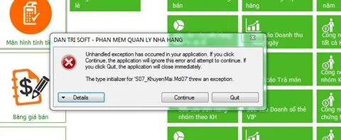 Hiện tượng: Sau khi cài đặt xong phần mềm Dân Trí Soft, đăng nhập vào phần mềm bình thường nhưng khi thao tác nghiệp vụ thì hiện thông báo như ảnh dưới "Unhandle exception has occurred in your application...".