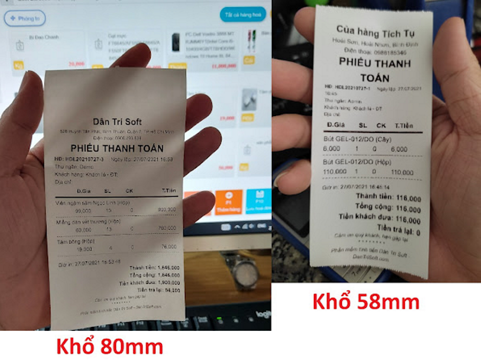 | Khổ in K80mm và K58mm với máy in nhiệt khi dùng phần mềm bán hàng miễn phí hoàn toàn DanTriSoft |