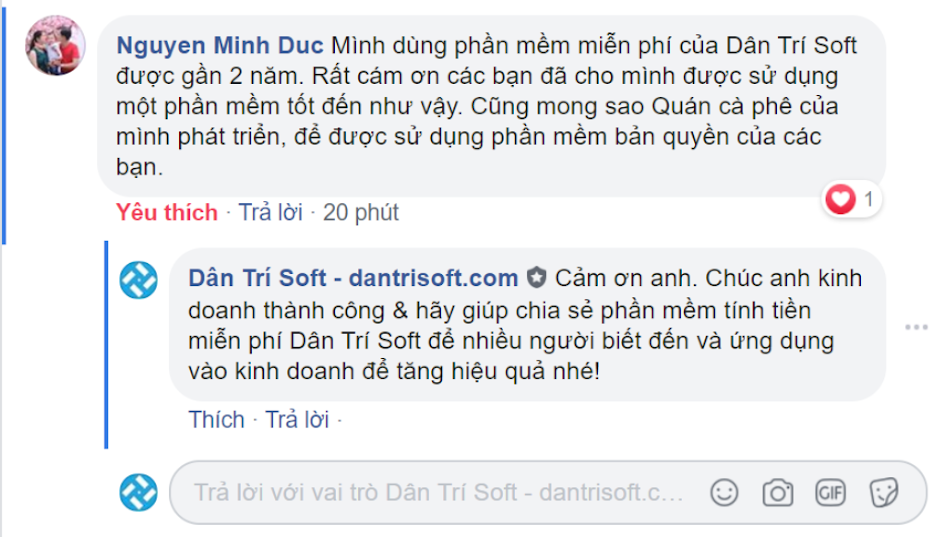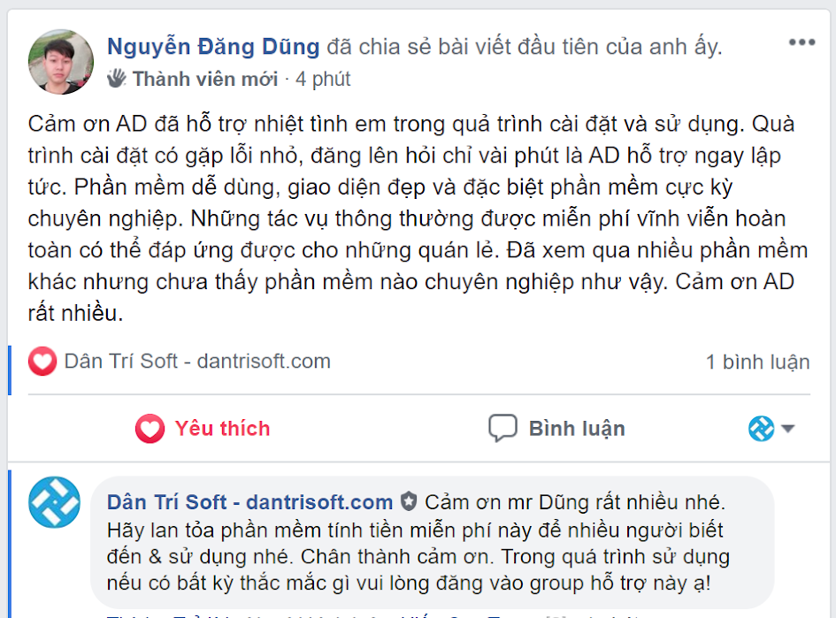 Đã tìm hiểu và thử qua nhiều phần mềm bán hàng miễn phí, cuối cùng thấy rõ chỉ có phần mềm bán hàng miễn phí DanTriSoft là dùng vĩnh viễn không giới hạn thời gian, phần mềm tiện ích và có tài liệu hướng dẫn chi tiết để học được khi nào cần. Cảm ơn công ty DanTriSoft đã dành tặng phần mềm thiết thực này đến tôi và cộng đồng.